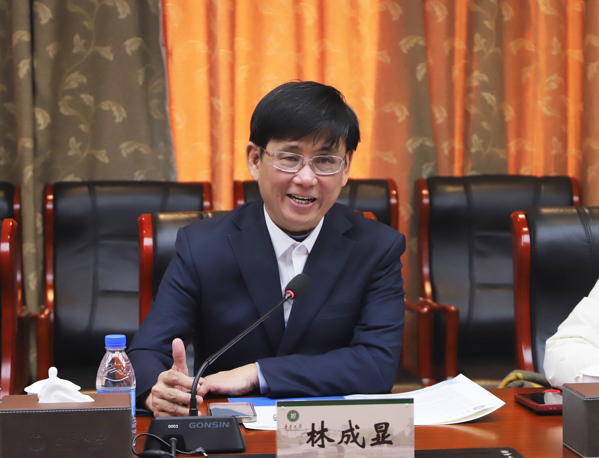 林成显对鲁东大学近年来高质量转型发展取得的成绩表示赞赏。他介绍了雒鸿大学的发展现状和优势特色,并回顾了两校通过交流合作取得的丰硕成果。他期待以此次访问为契机,两校在人才联合培养、实习就业、科研合作、国际会议等方面开展更加广泛而深入的合作与交流,培养出更多服务于两国“一带一路”倡议和“两廊一圈”合作的优秀人才。
