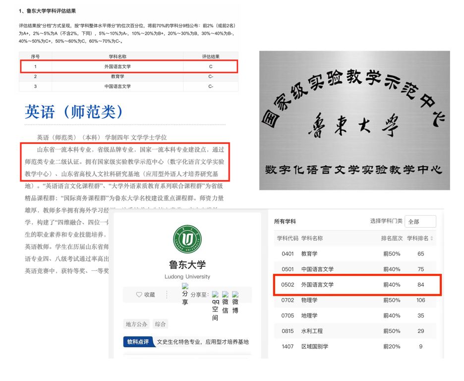学科建设成果丰硕,核心竞争力持续攀升。外国语言文学一级学科在教育部第五轮学科评估中获评C 级,软科排名连续三年稳居前 50%,2025 年跃升至前 35%;该一级学科及翻译专业学位硕士点通过周期性合格评估,新增区域国别学一级学科硕士学位授权点。英语专业获评山东省一流本科专业、入选国家级一流本科专业建设点,顺利通过师范专业二级认证;国家级实验教学示范中心圆满完成教育部阶段性考察。