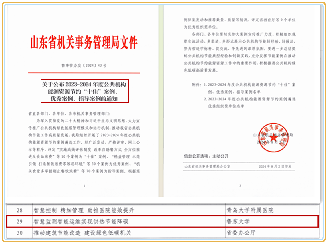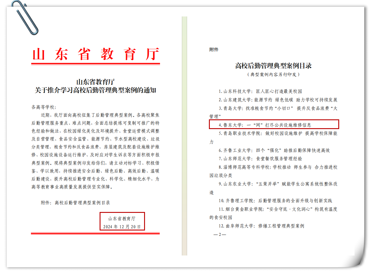 智慧节能协同共进,数字赋能树样本。建成智慧供热、能源管控等系统,打造节能节支“鲁大样本”,入选省级数字化赋能与公共机构节能优秀案例;智慧餐厅实现食材溯源,2个餐厅分获省级星级、示范食堂。依托智慧平台建立能耗异常预警与设备预防性维护机制,既降能耗又提效率,形成可复制的“鲁大经验”,2022年荣获山东省学校后勤协会“节能减排先进院校”荣誉称号。2022年后勤处按照学校要求接管全校基础设施零星维修工作,发挥“自有班组+校外服务组”联合优势,年均处理工单2.3万余单,好评率97%以上,实现从“被动维修”向“主动维修”转变,逐步改善校园维修难题。建成网上报修平台、水电费网上自助缴费系统;引进医疗管理系统,实现医疗信息的数字化和流程的自动化。开展节约能源资源讲座及“节水宣传周”“全国节能宣传周”等主题活动;举办大学生节能减排社会实践与科技竞赛,持续推进低碳校园建设,2023年荣获山东省学校后勤协会“低碳校园建设先进单位”荣誉称号。