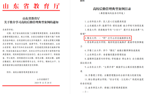 智慧节能协同共进,数字赋能树样本。建成智慧供热、能源管控等系统,打造节能节支“鲁大样本”,入选省级数字化赋能与公共机构节能优秀案例;智慧餐厅实现食材溯源,2个餐厅分获省级星级、示范食堂。依托智慧平台建立能耗异常预警与设备预防性维护机制,既降能耗又提效率,形成可复制的“鲁大经验”。建成在线学习平台,在疫情防控、技能培训、知识普及等方面发挥了积极作用。建成网上报修平台、水电费网上自助缴费系统,实现网上报修、水电缴费。引进医疗管理系统,实现了医疗信息的数字化和流程的自动化,为师生提供更便捷、高效的医疗服务。荣获山东省学校后勤协会2022年度“节能减排先进院校”荣誉称号。