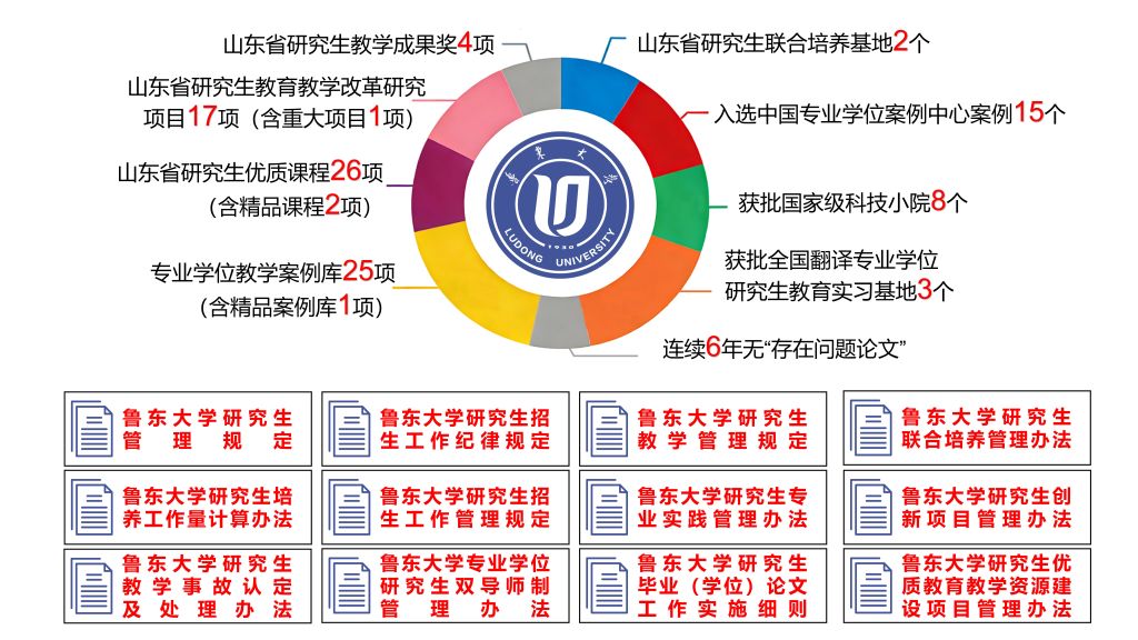 践行鲁大质量文化,教育教学改革稳步推进,质量保障体系日益完善。“十四五”期间,不断加强教育改革和教学资源建设,获山东省研究生教学成果奖4项、山东省研究生教育教学改革研究项目17项(重大项目1项)、山东省研究生优质课程26项(含精品课程2项)、专业学位教学案例库25项(含精品案例库1项)。获批全国翻译专业学位研究生教育实习基地3个,山东省研究生联合培养基地2个,入选中国专业学位案例中心案例15个,获批国家级科技小院8个。修订出台《鲁东大学研究生管理规定》等13个制度性文件,从招生、培养、实践到学位授予的全链条研究生质量保障体系愈发健全。在国务院学位办组织的学位论文抽检中,均无“存在问题论文”。