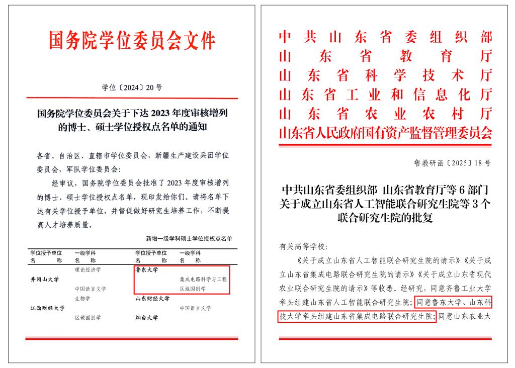 服务国家发展大逻辑,学位点布局结构持续优化。“十四五”期间,新增6个一级学科硕士学位授权点和11个硕士专业学位授权类别,较“十三五”分别增长20%、57%,尤其是学校实现了集成电路科学与工程、区域国别学等交叉学科门类硕士点的突破,同时填补了省属高校集成电路科学与工程一级学科硕士点的空白,并受省教育厅委托牵头筹建山东省集成电路联合研究生院。现有1个服务国家特殊需求博士人才培养项目,23个一级学科硕士学位授权点,23个硕士专业学位授权类别,理工农交叉学科门类硕士点24个(占比52.3%),参加学位点周期性合格评估的16个硕士点全部顺利通过,学位点整体布局持续优化,服务区域发展能力持续增强。