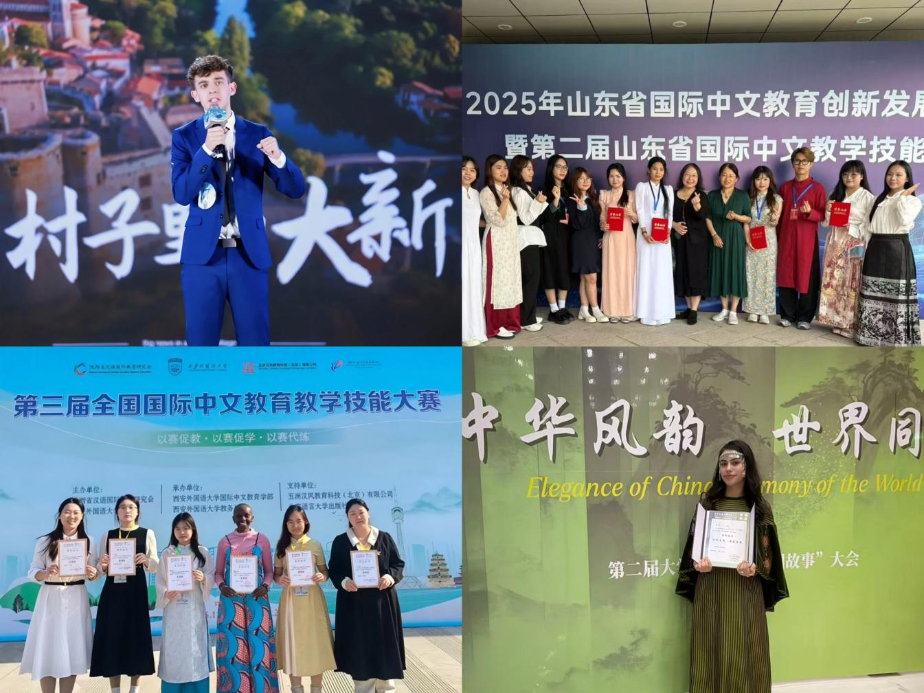 留学生培养多维创新成效显著。学院持续优化留学生培养体系,生源国别覆盖82个国家,近五年培养学生近千名,学历教育层次不断提升,累计培养汉语国际教育专业外国硕士生近80名。学院以培养知华友华人才为导向,创新培养路径,建设了中医药文化体验基地等10余个实践平台,打造“国际文化节”品牌活动,并与泰国、越南等多所高校建立联合培养机制,营造了“中外融通”的文化氛围。新西兰籍学生刘昭昂获“汉语桥”大洋洲赛区冠军,法国籍学生马于思在2025年全球“汉语桥”故事会中获二等奖。学生在“黄河湾”国际青年汉语大赛、“儒家经典诵读”“用外语讲中国故事”等文化类比赛中累计获奖60余项。在教学技能类竞赛中,留学生在山东省国际中文教学技能大赛等赛事中获一等奖9项,展现了卓越的教学实践能力。