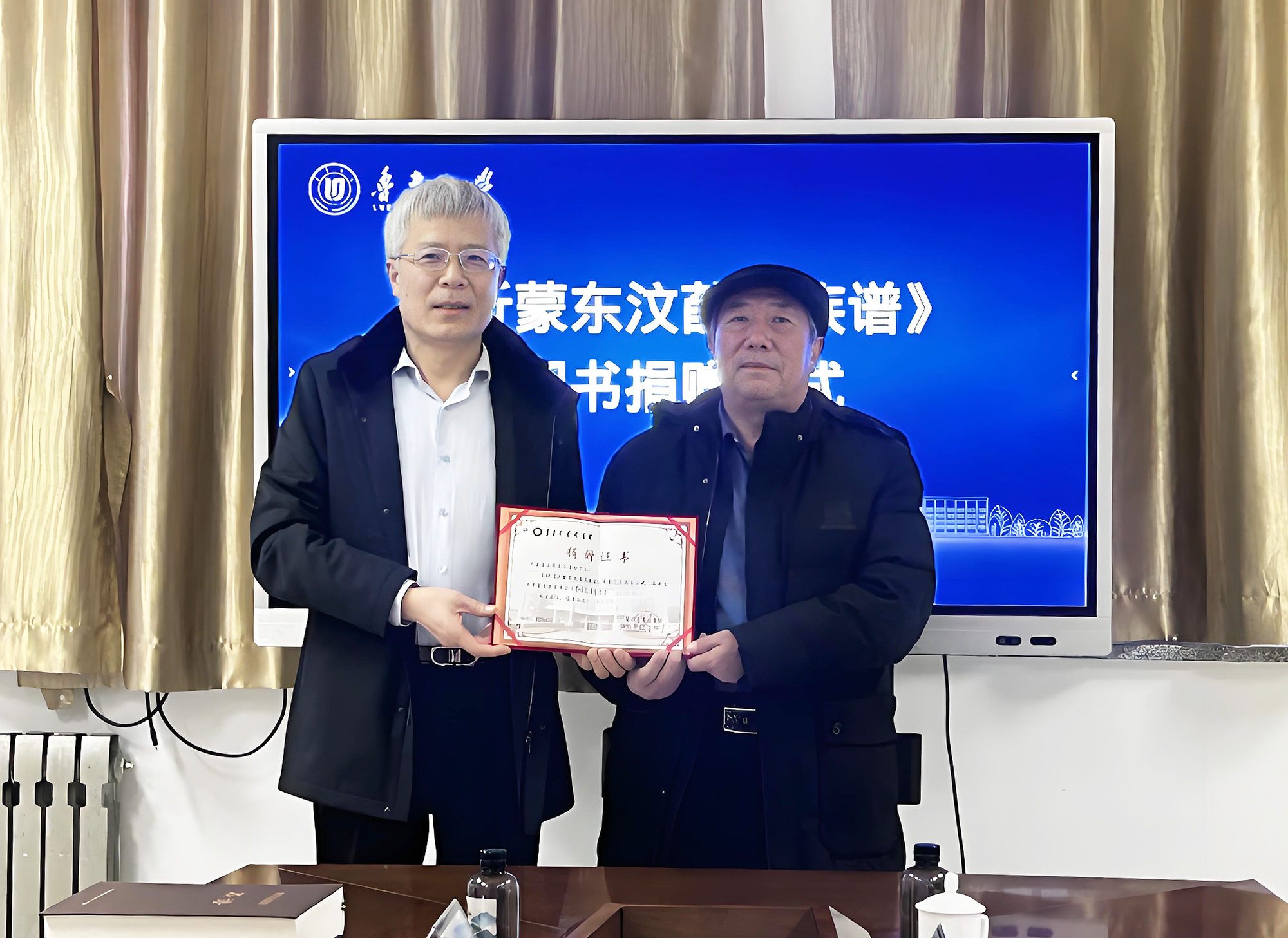 2026年1月6日,我校在图书馆举行《沂蒙东汶薛氏族谱》捐赠仪式。沂蒙东汶薛氏宗亲联谊会理事长薛尚基,我校党委书记王庆教授出席仪式并讲话。