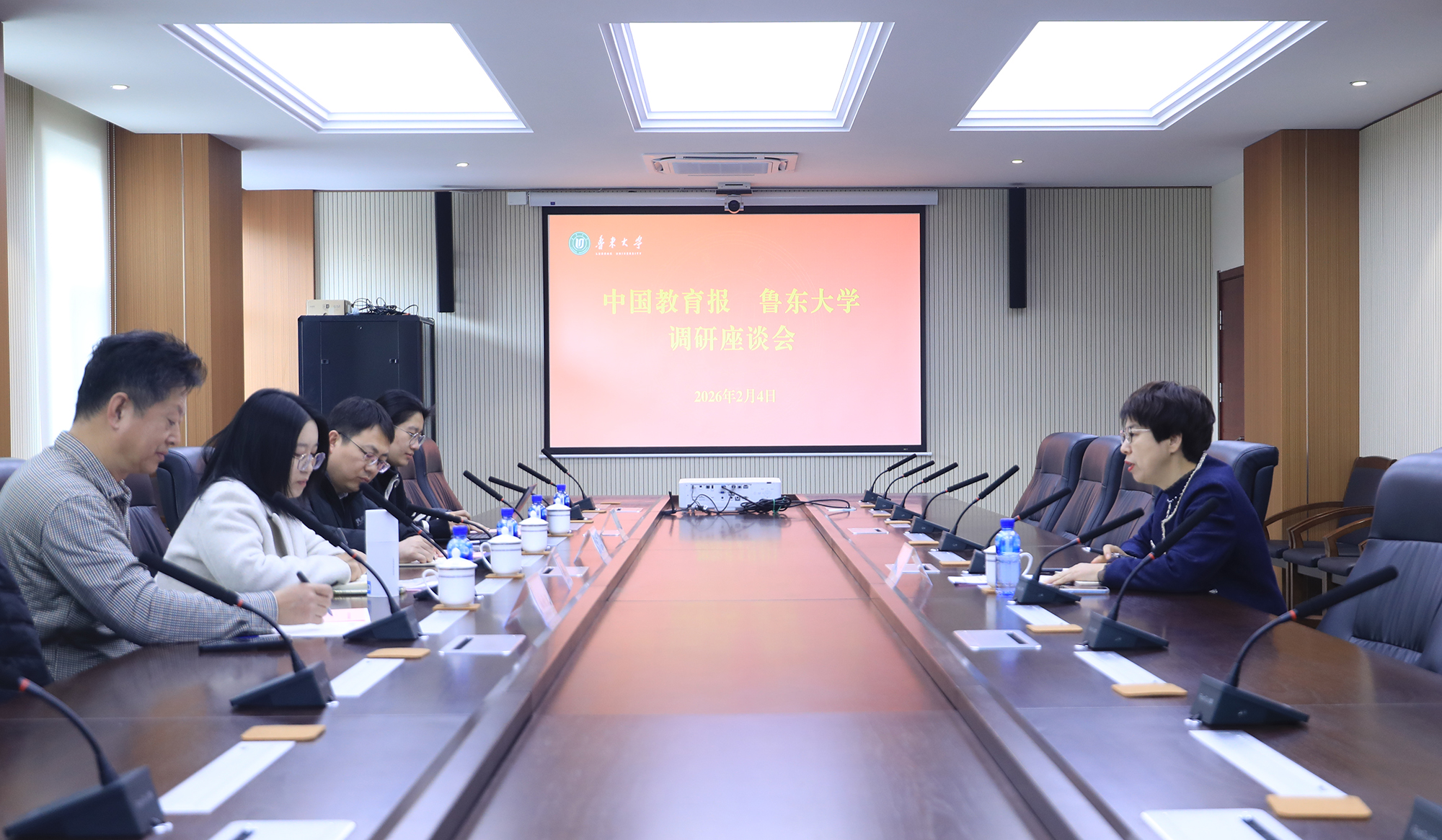 2026年2月4日,山东省教育厅办公室原一级调研员、新闻中心主任、中国教育报山东站指导专员宋全政,中国教育报刊社山东记者站站长魏海政,中国教育报记者孙雨新、田玉等到我校调研宣传思想文化工作和国家智慧教育公共服务平台应用情况。党委常委、副校长向平,党委常委、宣传部部长丛涛出席调研活动。