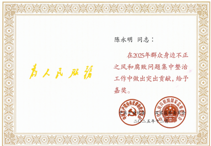 我校纪检监察干部陈永明因在2025年群众身边不正之风和腐败问题集中整治工作中表现突出,获得中央纪委国家监委个人嘉奖。