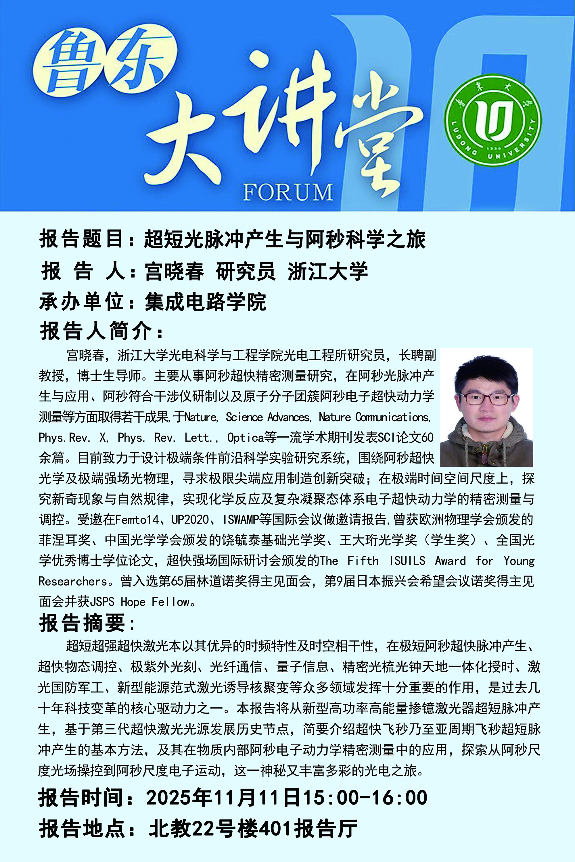 鲁东大讲堂预告丨超短光脉冲产生与阿秒科学之旅【2025年11月11日15:00】