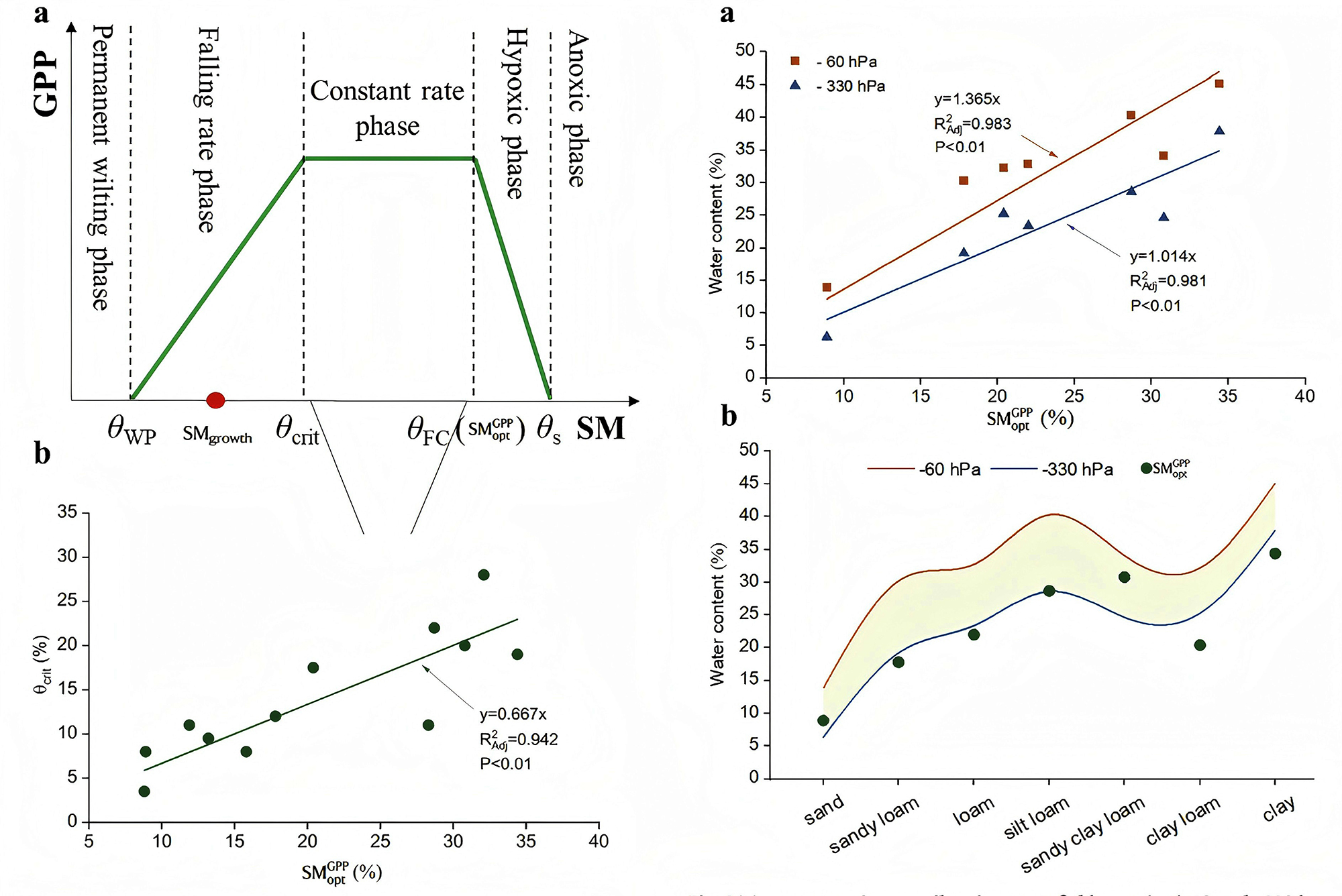 该研究结果显示,表观最优土壤水分与田间持水量在多站点数据上高度吻合,决定系数为0.98。同时,研究团队进一步量化了临界土壤水分阈值与表观最优土壤水分之间的关系。平均而言,临界阈值约为表观最优值的67%,两者共同界定了植物可利用水分的范围,并对应较高生产力的稳定平台期。