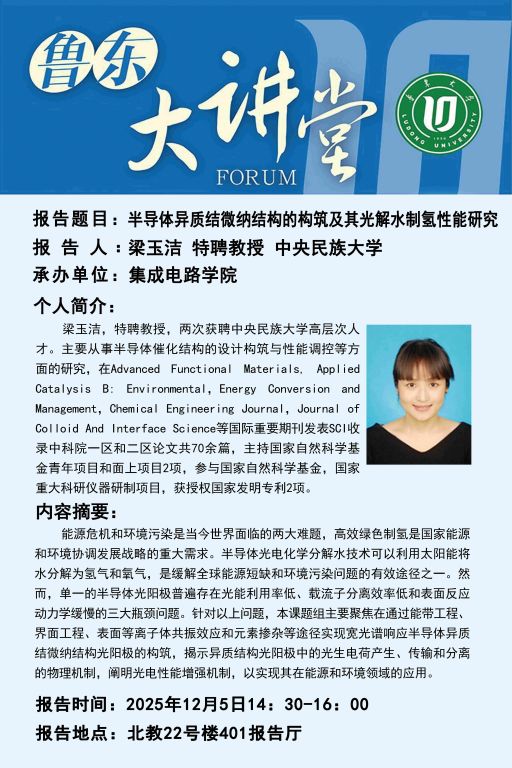 鲁东大讲堂预告丨半导体异质结微纳结构的构筑及其光解水制氢性能研究【2025年12月5日14:30】