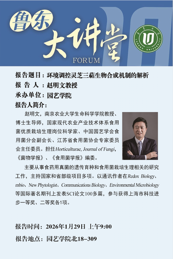 鲁东大讲堂预告丨环境调控灵芝三萜生物合成机制的解析【2026年1月29日9:00】