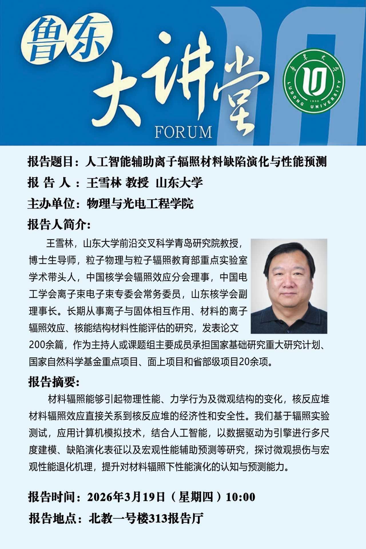 鲁东大讲堂预告丨人工智能辅助离子辐照材料缺陷演化与性能预测【2026年3月19日10:00】