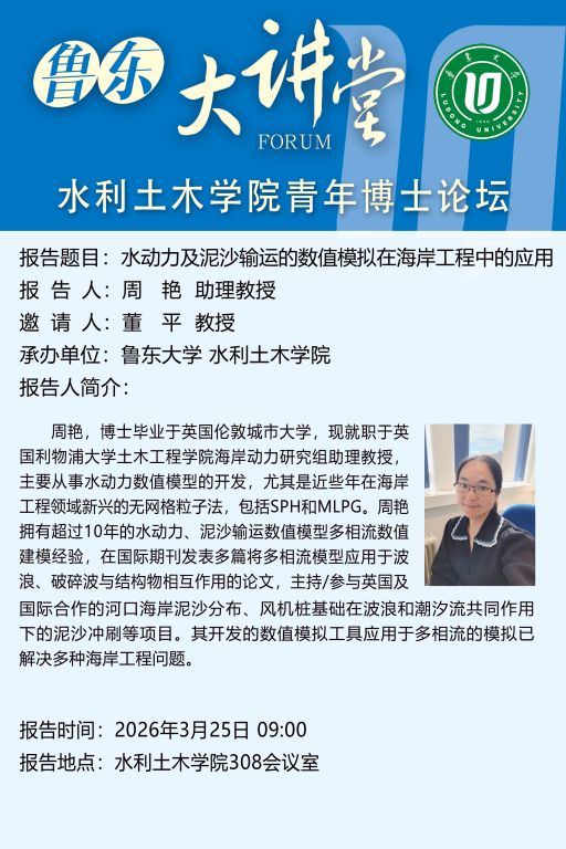 鲁东大讲堂预告丨水动力及泥沙输运的数值模拟在海岸工程中的应用【2026年3月25日9:00】