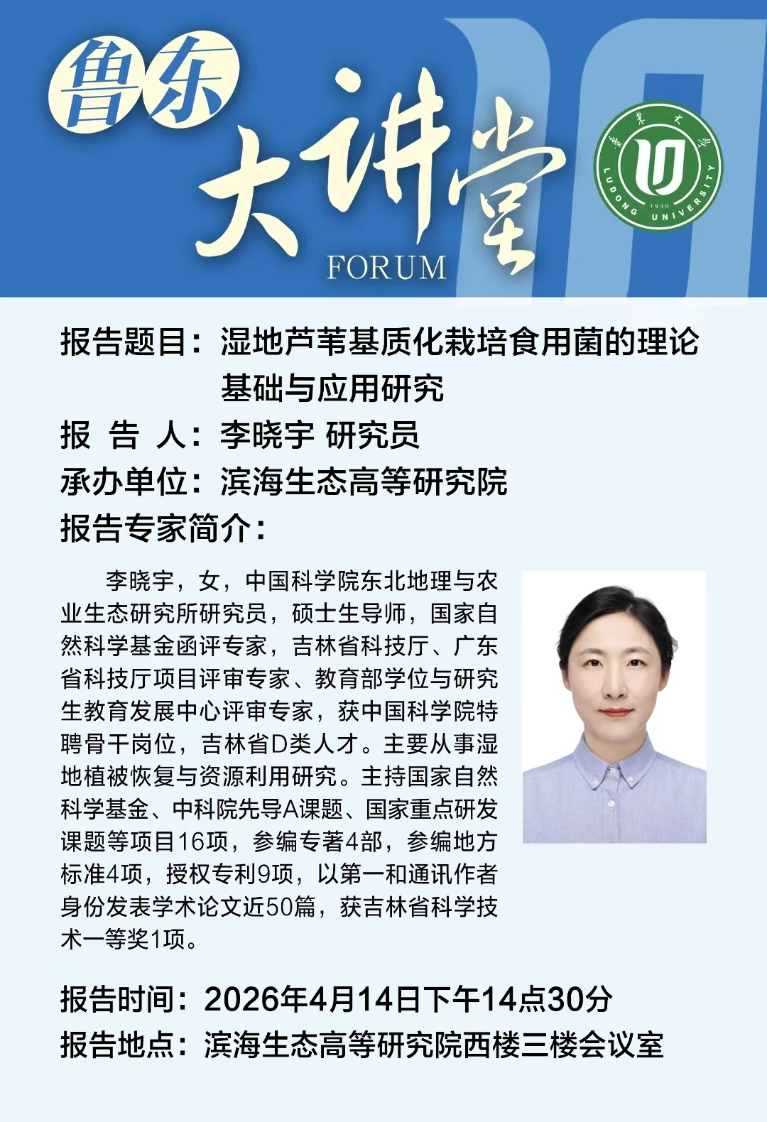 鲁东大讲堂预告丨湿地芦苇基质化栽培食用菌的理论基础与应用研究【2026年4月14日14:30】