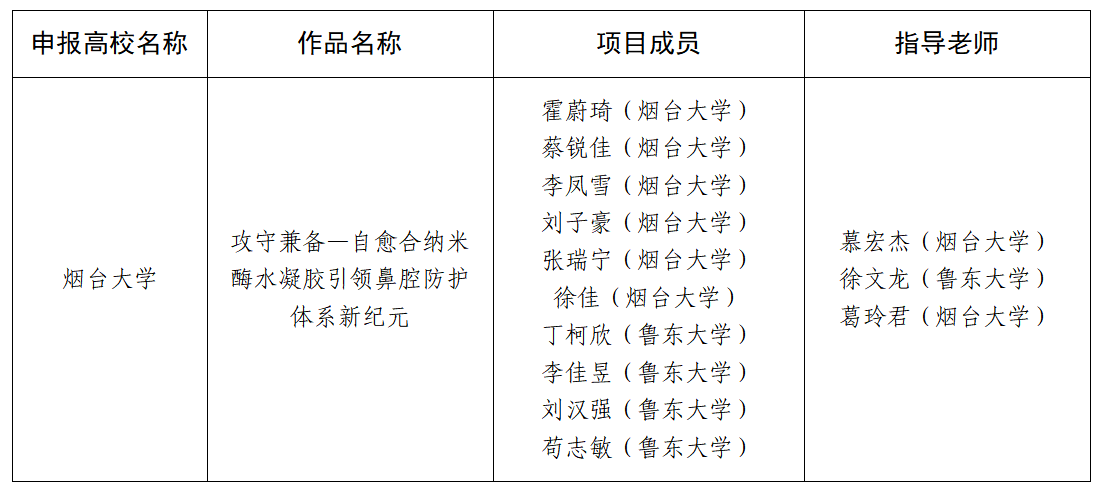 现对我校学生跨校参加第十五届“挑战杯”山东省大学生创业计划竞赛项目情况进行公示。我校本科生丁柯欣、李佳昱、刘汉强、苟志敏为项目成员跨校参加由烟台大学作为申报单位的第十五届“挑战杯”山东省大学生创业计划竞赛,参赛项目名称《攻守兼备—自愈合纳米酶水凝胶引领鼻腔防护体系新纪元》。